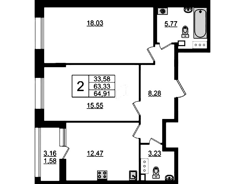 Двухкомнатная квартира на 12-ом этаже 64,91 кв.м