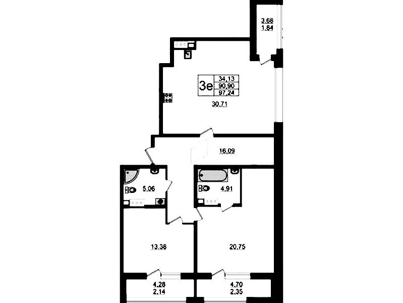 Двухкомнатная квартира на 9-ом этаже 97,24 кв.м