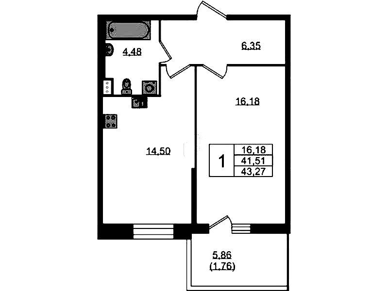 Однокомнатная квартира на 1-ом этаже 42,9 кв.м
