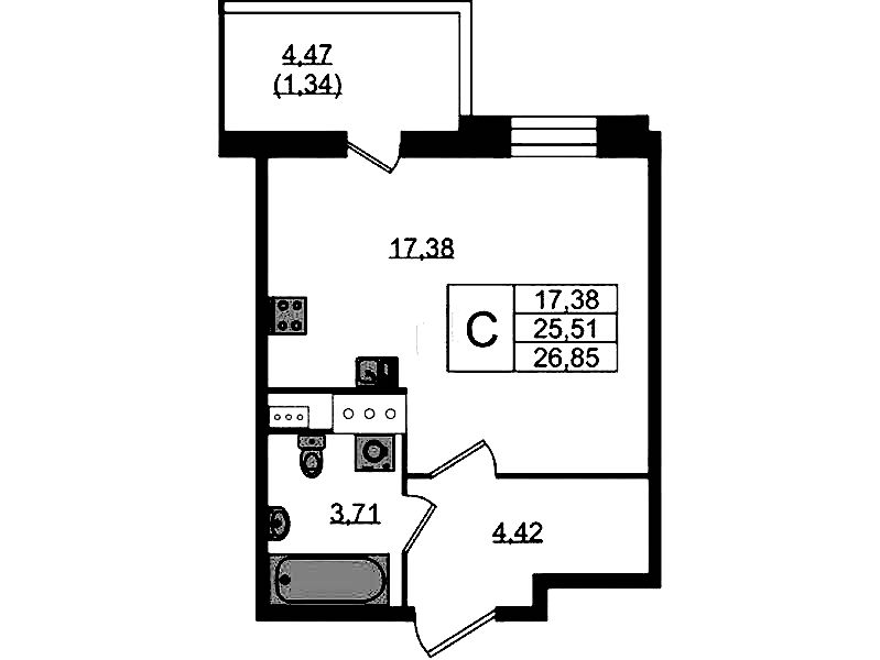 Квартира-студия на 12-ом этаже 26,6 кв.м