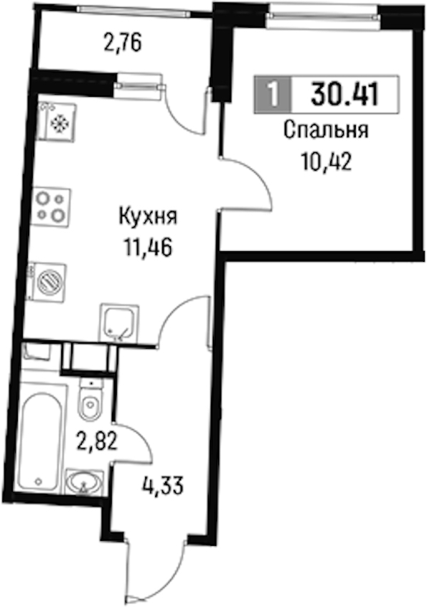 Однокомнатная квартира на 9-ом этаже 30,41 кв.м