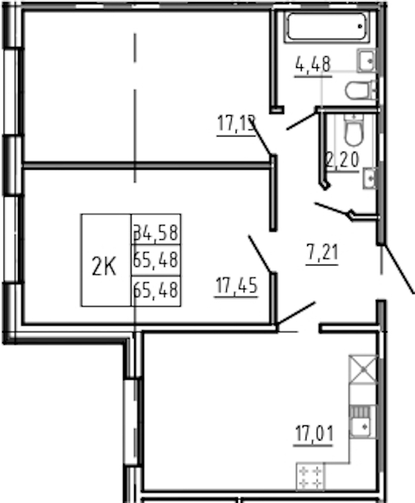 Двухкомнатная квартира на 1-ом этаже 65,48 кв.м