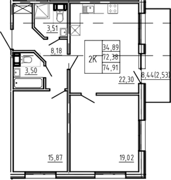 - Площадь74,91 м2