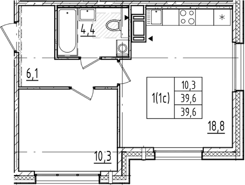 Однокомнатная квартира на 10-ом этаже 39,6 кв.м