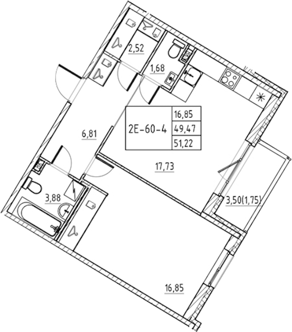Однокомнатная квартира на 3-ем этаже 51,22 кв.м