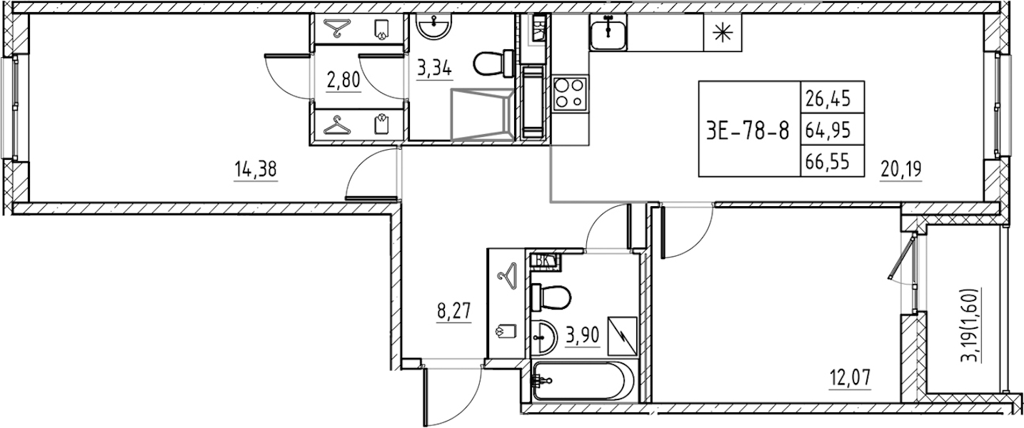 Двухкомнатная квартира на 3-ем этаже 66,55 кв.м