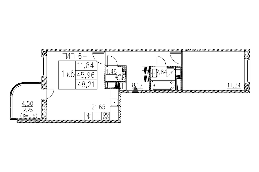 Однокомнатная квартира на 3-ем этаже 48,21 кв.м