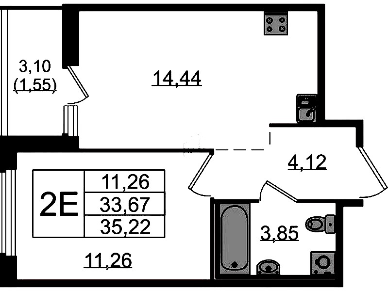 Однокомнатная квартира на 15-ом этаже 35,22 кв.м