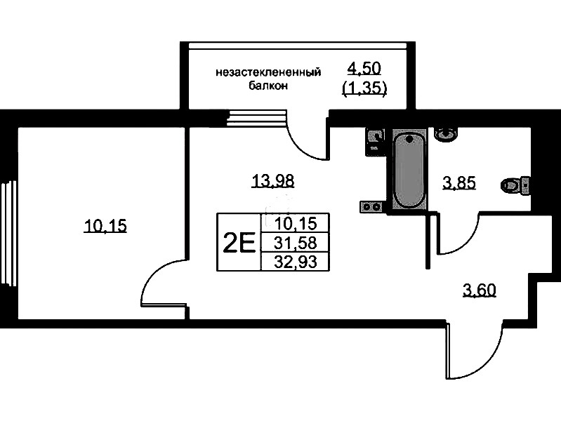 Однокомнатная квартира на 15-ом этаже 32,93 кв.м