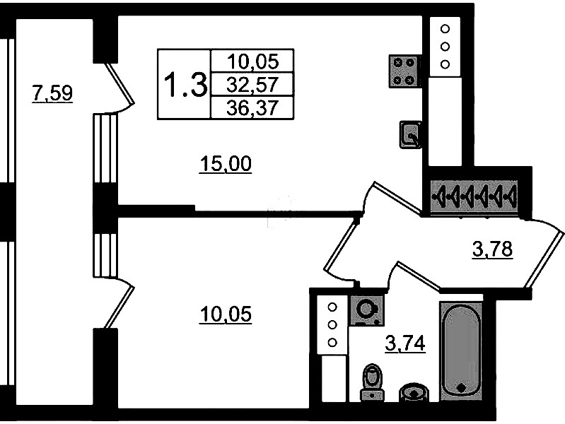 Однокомнатная квартира на 11-ом этаже 32,57 кв.м