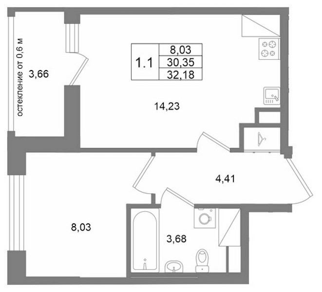 Однокомнатная квартира на 18-ом этаже 30,35 кв.м