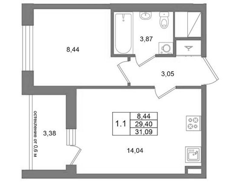 Однокомнатная квартира на 11-ом этаже 29,4 кв.м