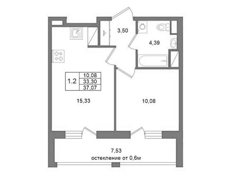 Однокомнатная квартира на 10-ом этаже 33,3 кв.м