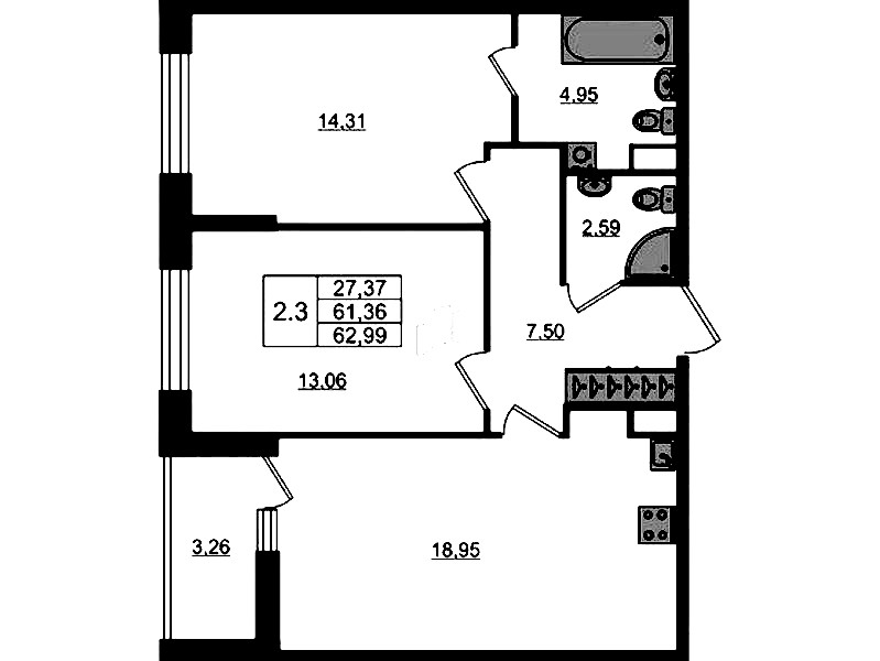 Двухкомнатная квартира на 2-ом этаже 61,36 кв.м