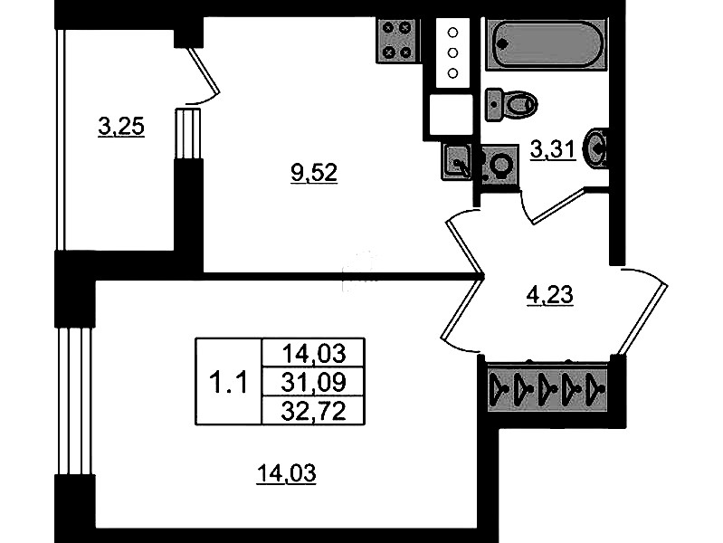 Однокомнатная квартира на 14-ом этаже 31,09 кв.м
