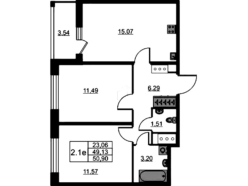 Двухкомнатная квартира на 21-ом этаже 49,13 кв.м