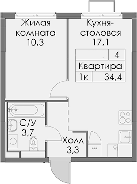 Однокомнатная квартира на 12-ом этаже 34,4 кв.м