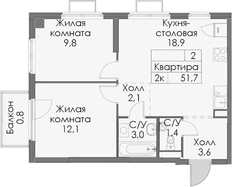 - Площадь51,7 м2