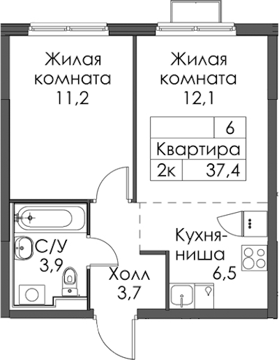 • Площадь37,4 м2