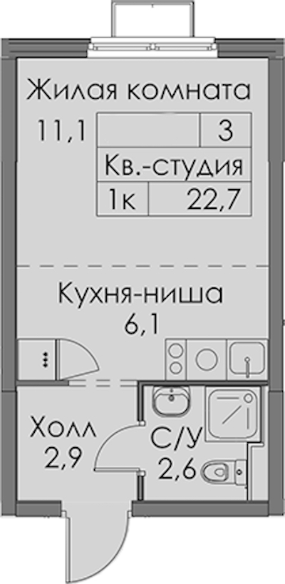 Квартира-студия на 6-ом этаже 22,7 кв.м