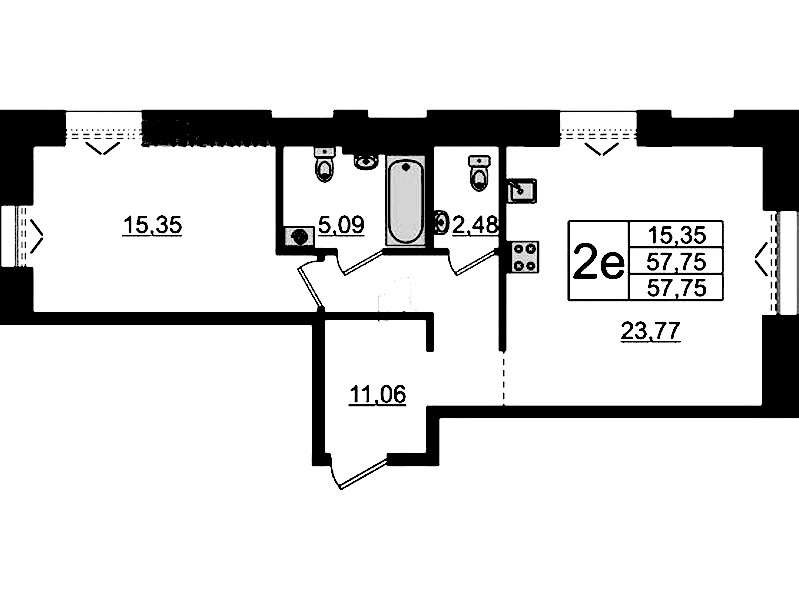Однокомнатная квартира на 2-ом этаже 57,75 кв.м