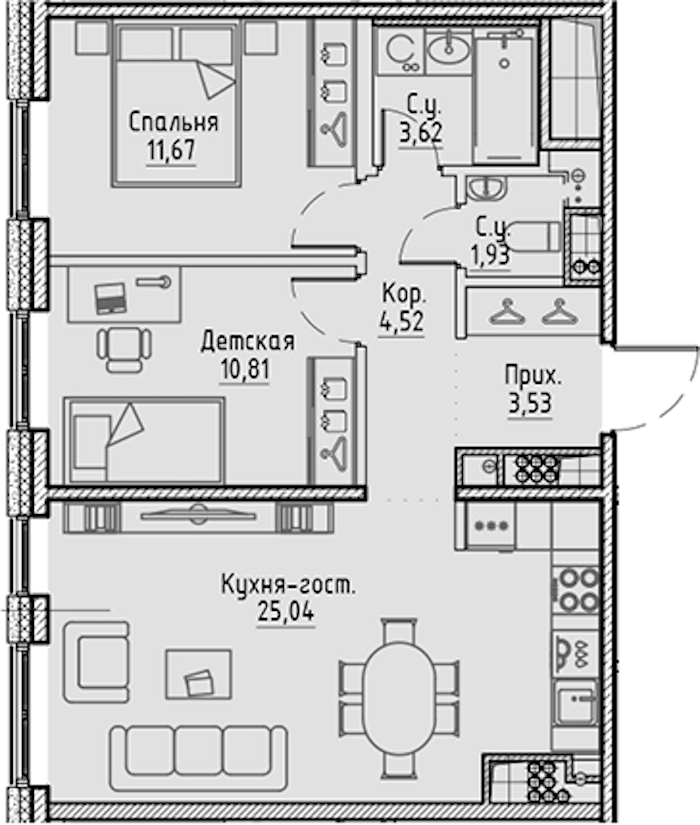 Двухкомнатная квартира на 10-ом этаже 61,12 кв.м
