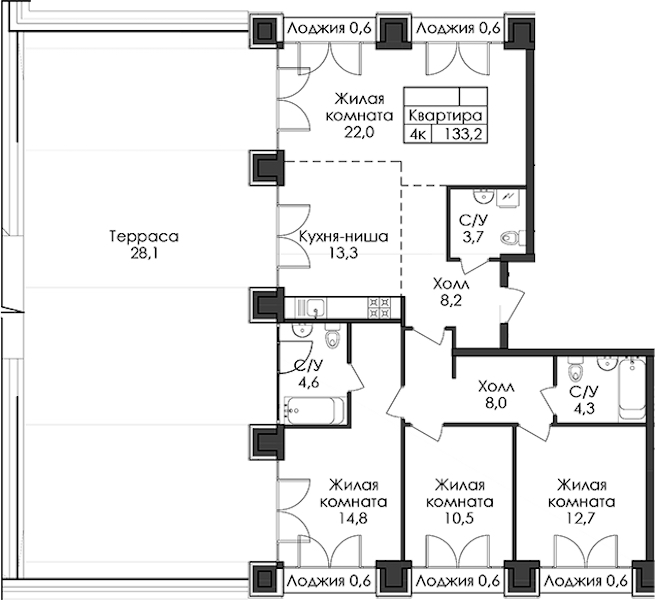 Трёхкомнатная квартира на 8-ом этаже 133,2 кв.м