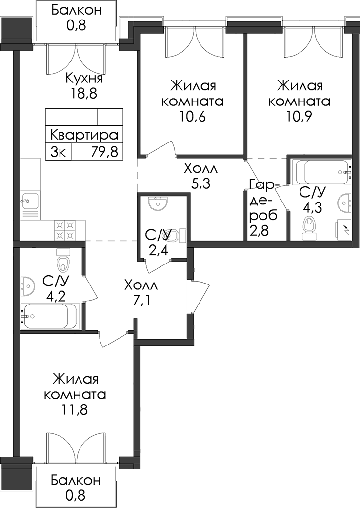Трёхкомнатная квартира на 7-ом этаже 79,8 кв.м