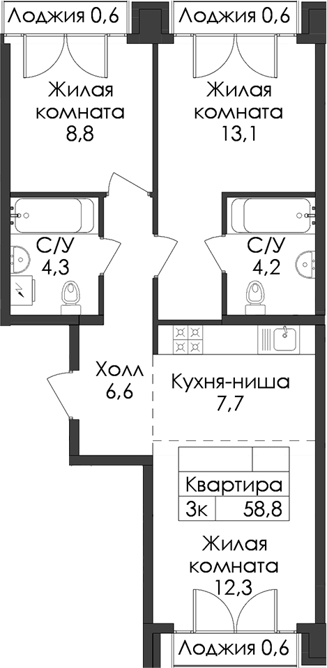 Двухкомнатная квартира на 8-ом этаже 58,8 кв.м