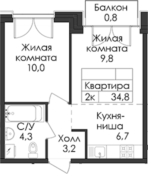 Однокомнатная квартира на 5-ом этаже 34,8 кв.м