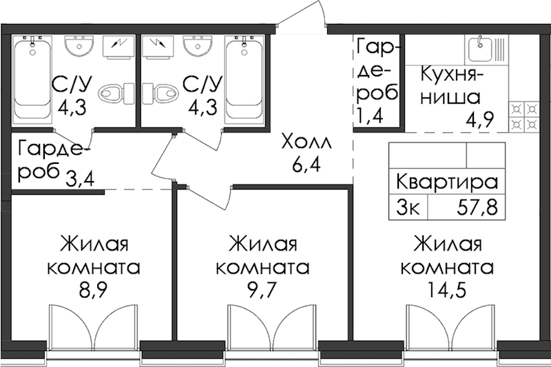 Двухкомнатная квартира на 3-ем этаже 57,8 кв.м