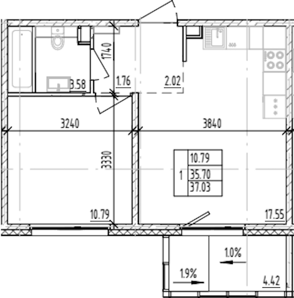 Однокомнатная квартира на 12-ом этаже 37,03 кв.м