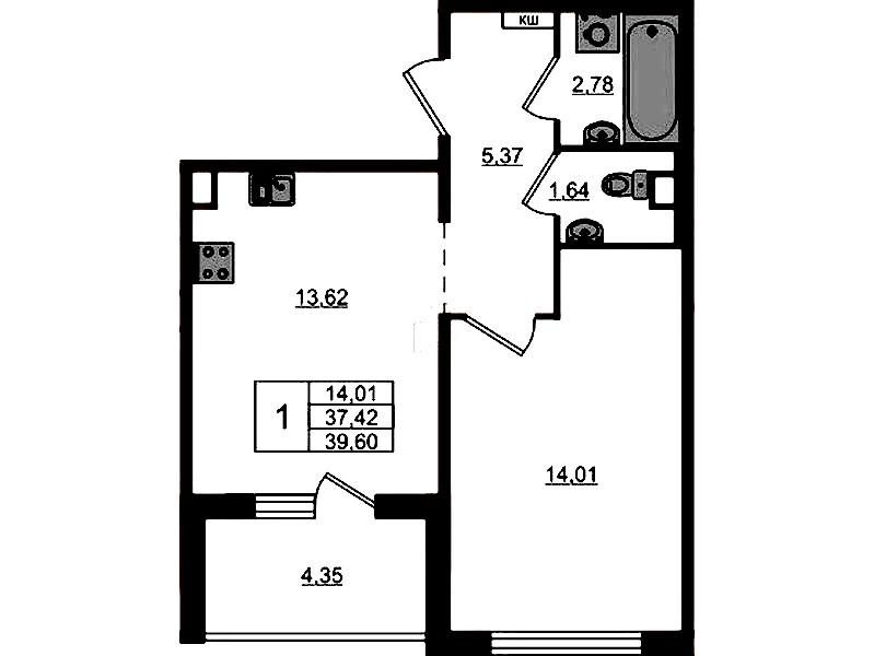 Однокомнатная квартира на 12-ом этаже 39,6 кв.м