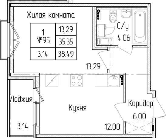 Однокомнатная квартира на 3-ем этаже 35,35 кв.м