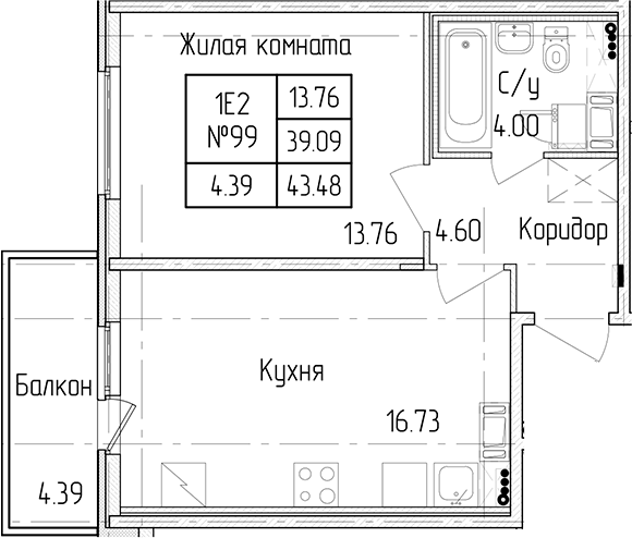 Однокомнатная квартира на 4-ом этаже 39,09 кв.м