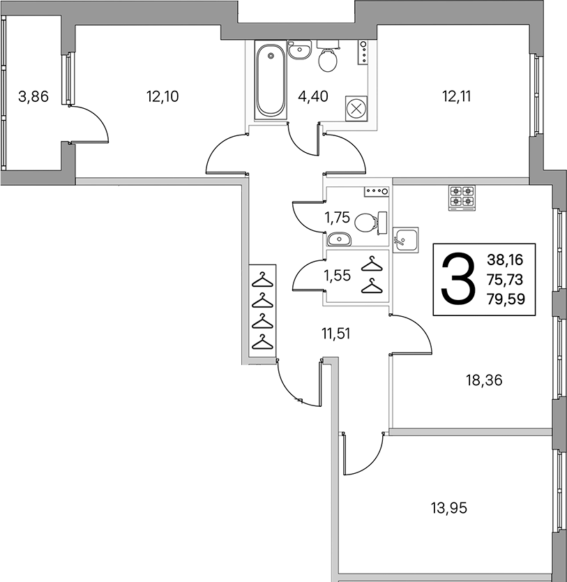 Трёхкомнатная квартира на 1-ом этаже 77,66 кв.м
