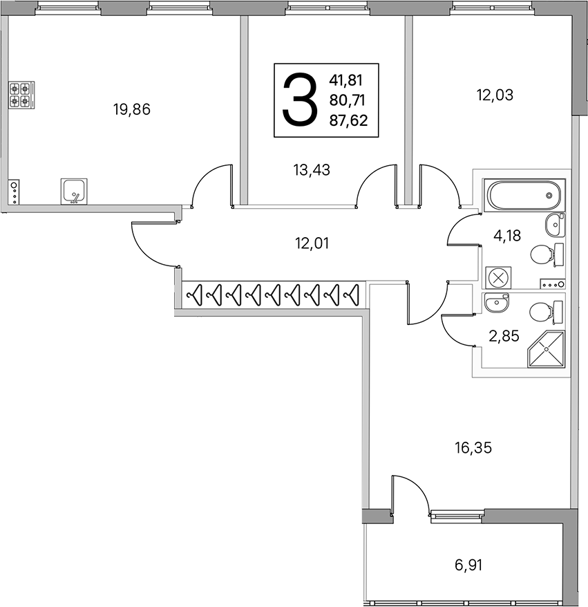 Трёхкомнатная квартира на 2-ом этаже 84,17 кв.м