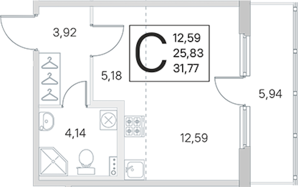 Квартира-студия на 1-ом этаже 25,83 кв.м