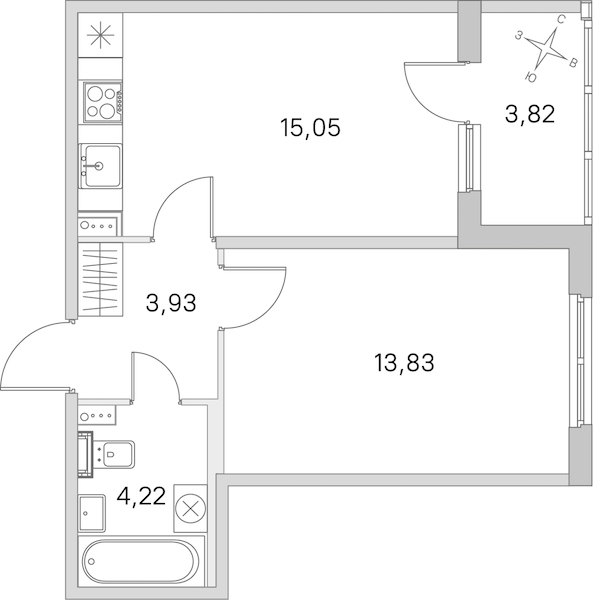 - Площадь кухни15,05 м2