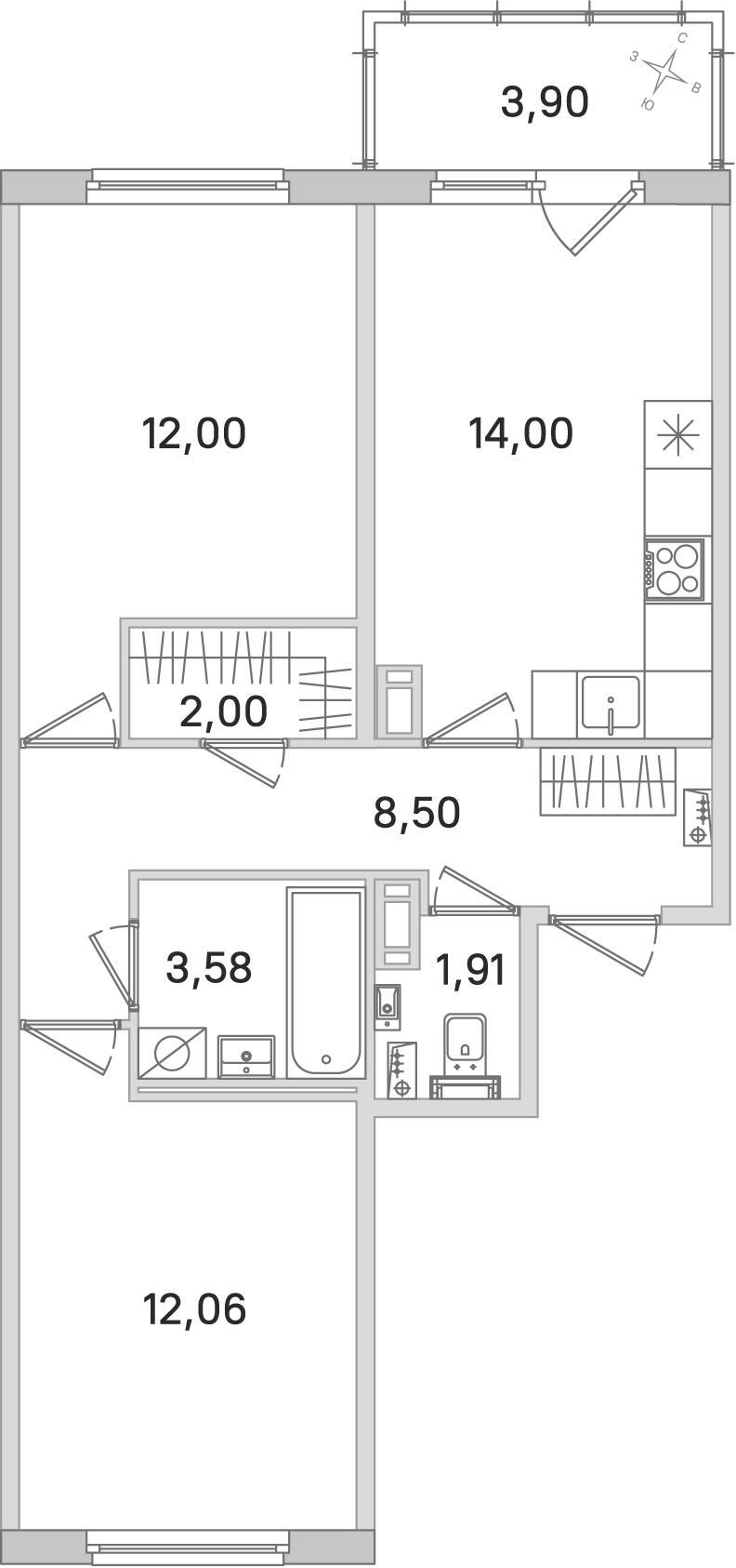 Двухкомнатная квартира на 3-ем этаже 54,05 кв.м