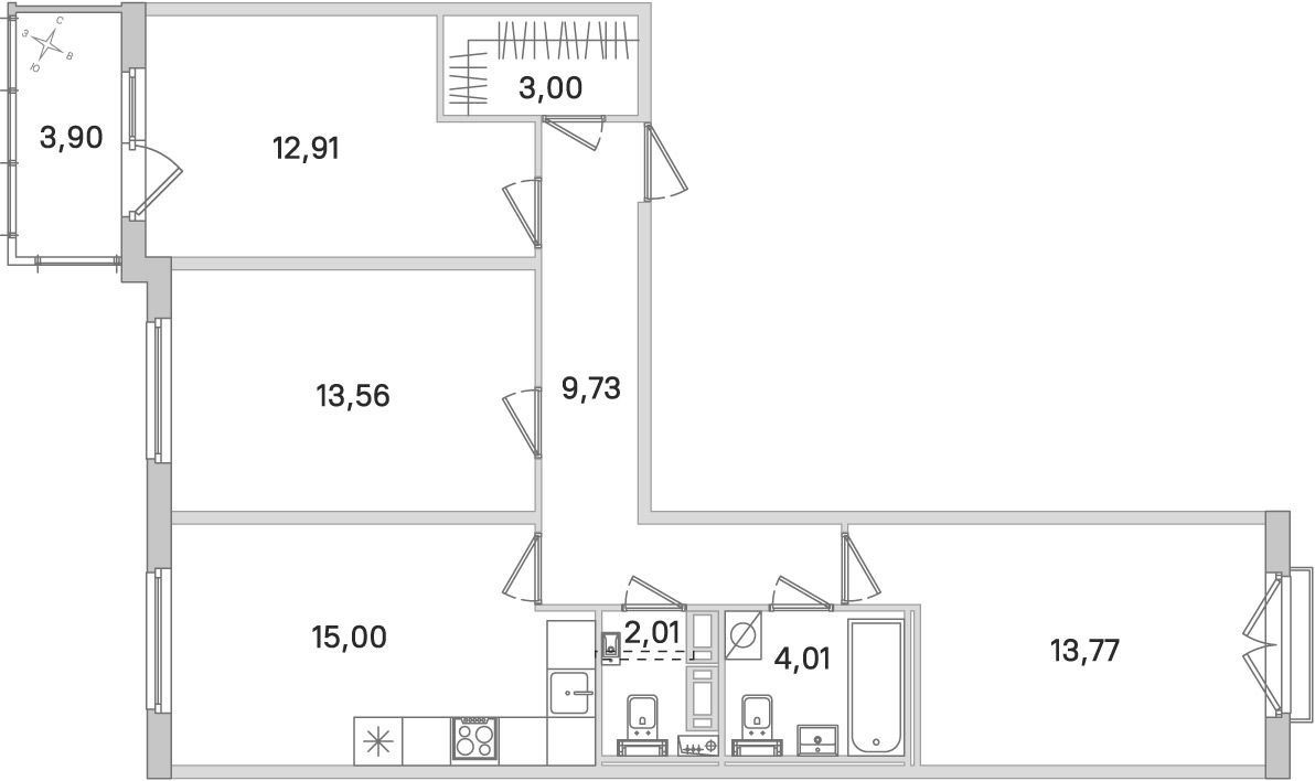 Трёхкомнатная квартира на 4-ом этаже 73,99 кв.м