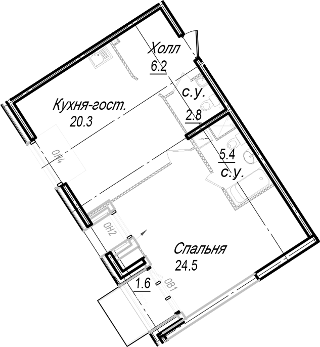 Однокомнатная квартира на 7-ом этаже 60 кв.м