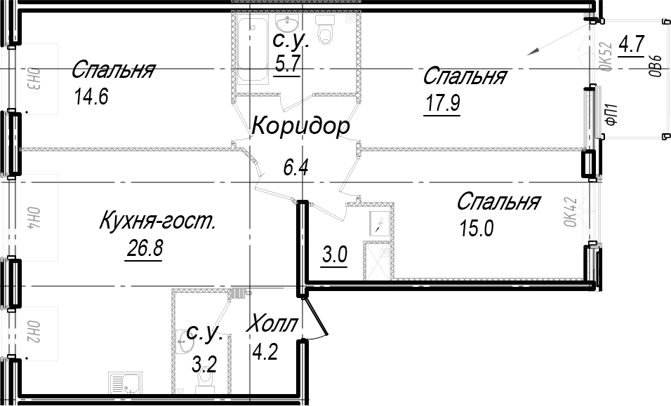 - Площадь кухни26,8 м2