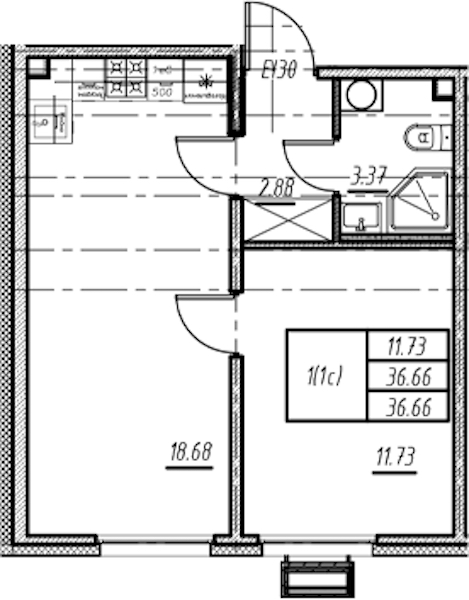 Однокомнатная квартира на 20-ом этаже 36,66 кв.м