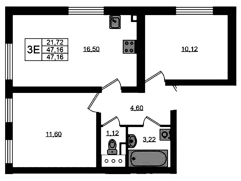 Двухкомнатная квартира на 19-ом этаже 47,16 кв.м