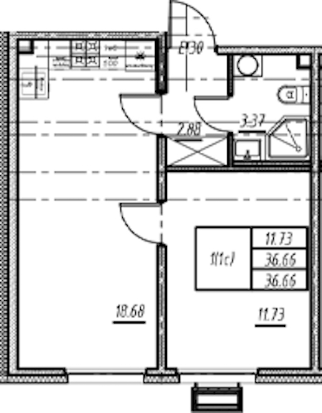 Однокомнатная квартира на 12-ом этаже 36,66 кв.м