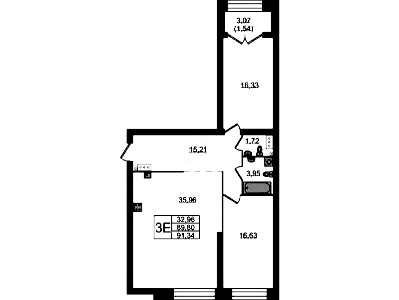 Двухкомнатная квартира на 3-ем этаже 91,34 кв.м