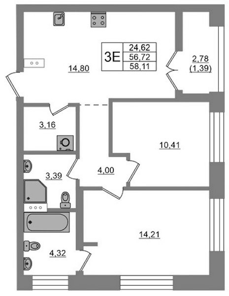 Двухкомнатная квартира на 7-ом этаже 58,11 кв.м