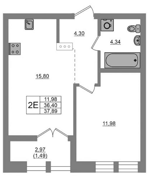 Однокомнатная квартира на 5-ом этаже 37,89 кв.м