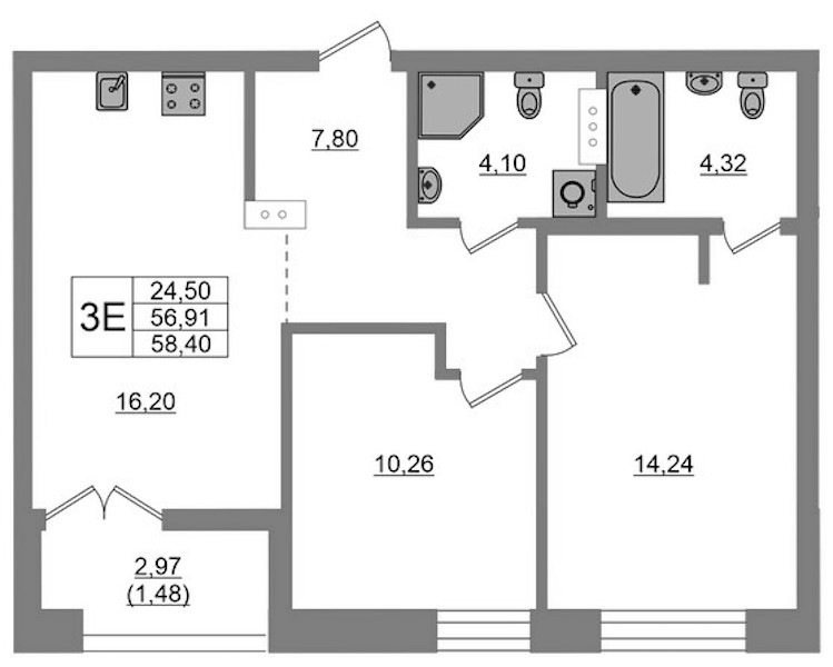 • Площадь58,4 м2